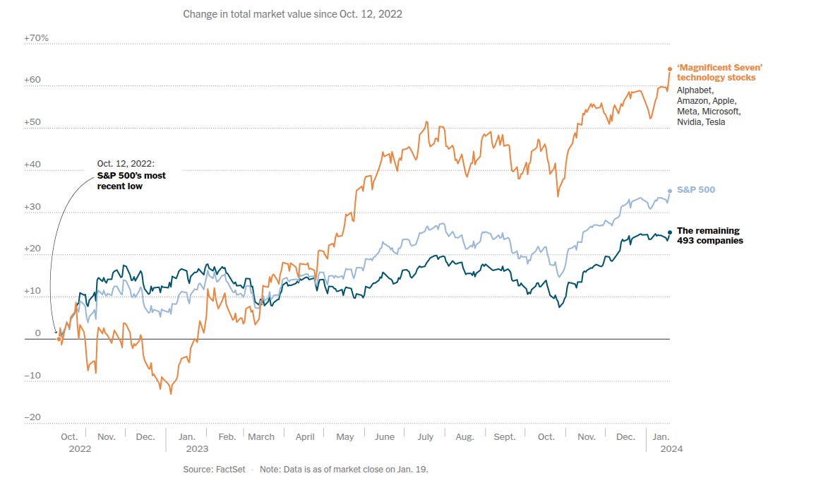 In the same period, the valuation of the “Magnificent Seven” on the U.S. stock market—the companies cashing in on this phenomenon (Apple, Amazon, Google, Meta, Tesla, Nvidia, and Microsoft)—has tripled, rising from $7 trillion to $19 trillion, and from representing 21% of the index to 35%.