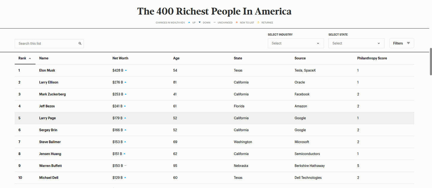 And we could go further. We could look inside the Forbes list and find that of those 400 billionaires, the 10 wealthiest have a combined net worth of 2.4 trillion dollars — a third of the entire list.